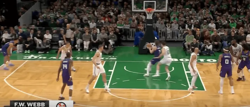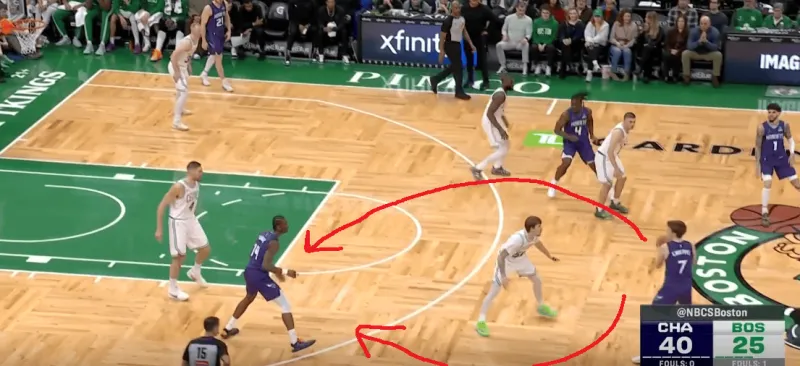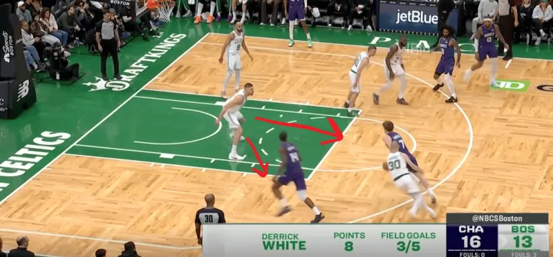 在手递手交球后,武切维奇在豪瑟已经身位落后的情况下,要同时处理克尼普尔的持球进攻和左侧迪亚巴特的快速顺下,而即使另一侧的怀特过来补防也为时已晚:
