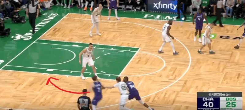 克尼普尔弧顶持球时,卡尔克布伦纳和科比-怀特同时提上打牛角发起,两个掩护方向供克尼普尔选择,在沃尔什的站位更靠上的情况下,克尼普尔选择走左侧惩罚没有提上的奎塔,从而获得三分出手的空位机会: