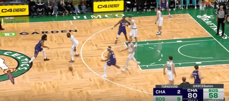 无球端,黄蜂在转换时同时拥有布里奇斯、米勒等人的空手切入,也拥有三球的视野,在推进时已经向左侧观察克尼普尔,得益于迪亚巴特的快下吸引冈萨雷斯的跟防,克尼普尔跟进接球恰好有空位的机会: